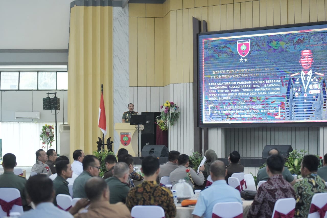 Makassar,77News.id. – Wujudkan Pemilu 2024 yang luber, jurdil, aman dan damai, Pangdam XIV/Hasanuddin Mayjen TNI Dr. Totok Imam Santoso, S.I.P., S.Sos., M.Tr (Han)., berinisiatif menggelar apel bersama Forkopimda, Komisi Pemilihan Umum (KPU) dan Badan Pengawas Pemilihan Umum (Bawaslu) Prov Sulselbartra, Para Rektor, Tokoh Agama (Toga), Tokoh Masyarakat (Tomas), Badan Eksekutif Mahasiswa (BEM), Organisasi Masyarakat (Ormas), Pimpinan Badan Usaha Milik Negara (BUMN) dan Perbankan serta Awak Media, bertempat di Balai Prajurit Hasanuddin (BPH) Kota Makassar. Kamis (21/09/2023).