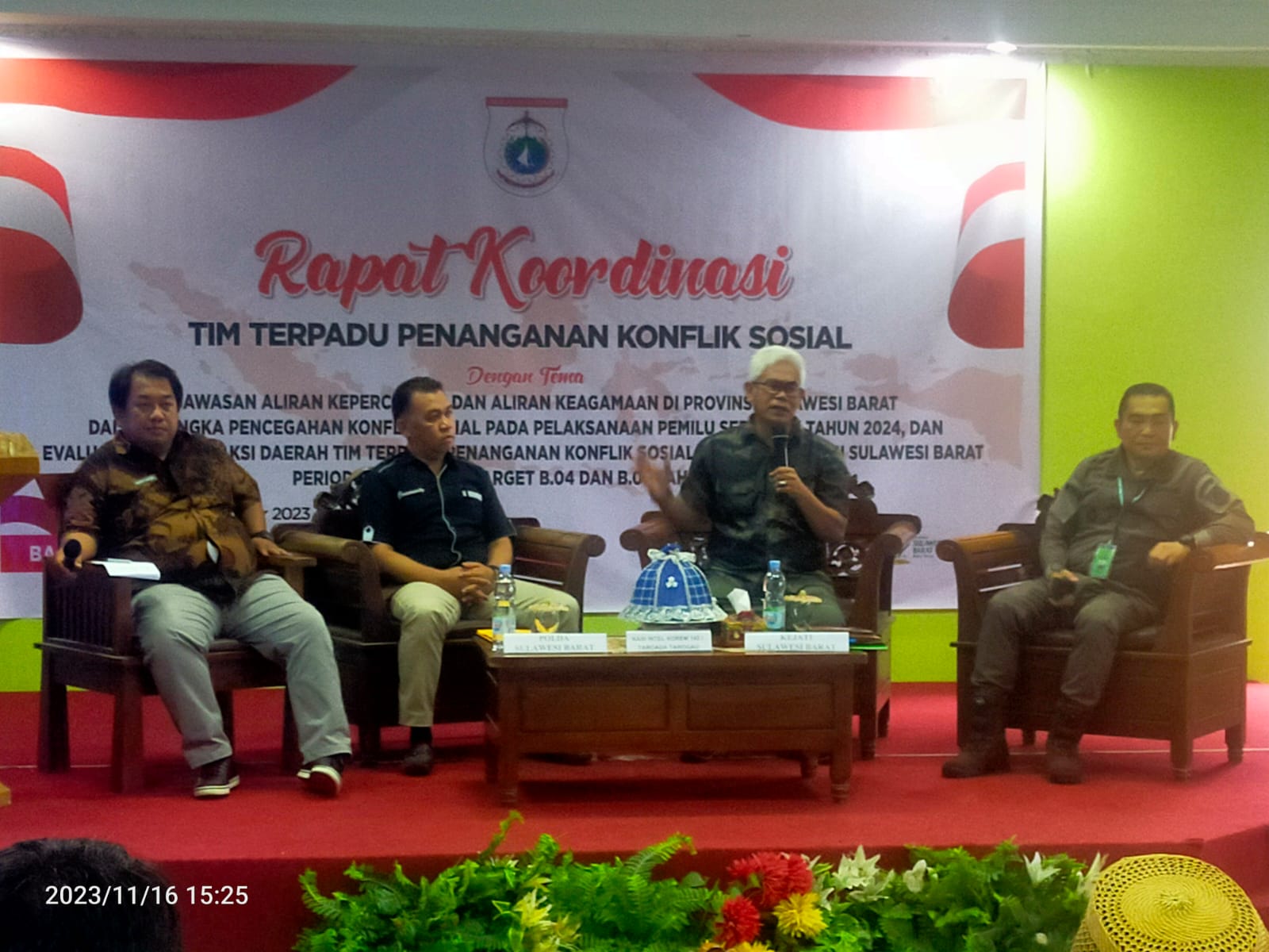 Sambutan Asisten Pemerintahan dan Kesejahteraan Rakyat Drs H. Herdin Ismail mengatakan bahwa kegiatan ini dalam rangka koordinasi pengawasan aliran kepercayaan dan aliran keagamaan, pencegahan konflik sosial pada pelaksanaan Pemilu serentak tahun 2024 serta evaluasi rencana aksi daerah tim terpadu penanganan konflik sosial tingkat Provinsi Sulawesi Barat.