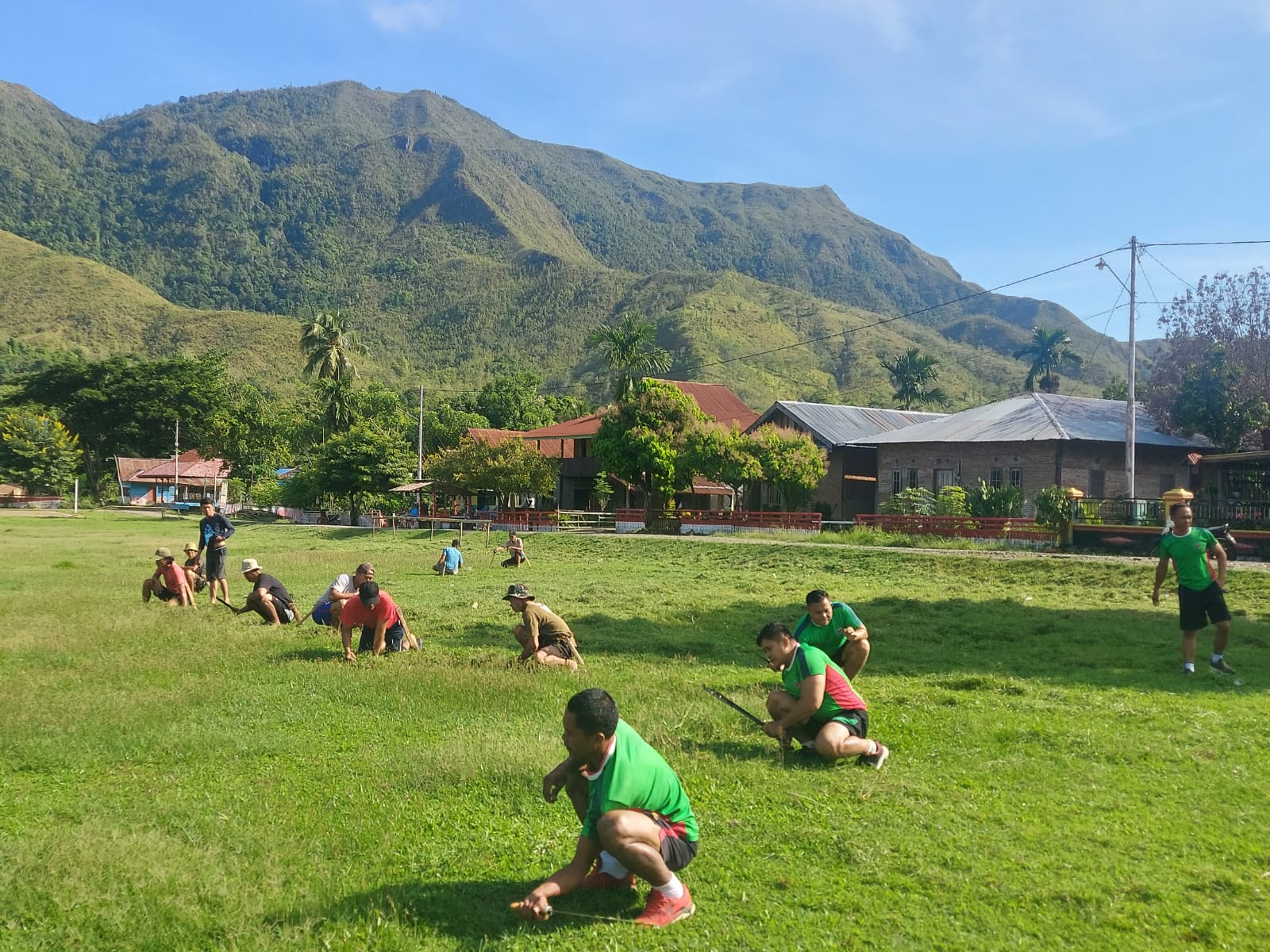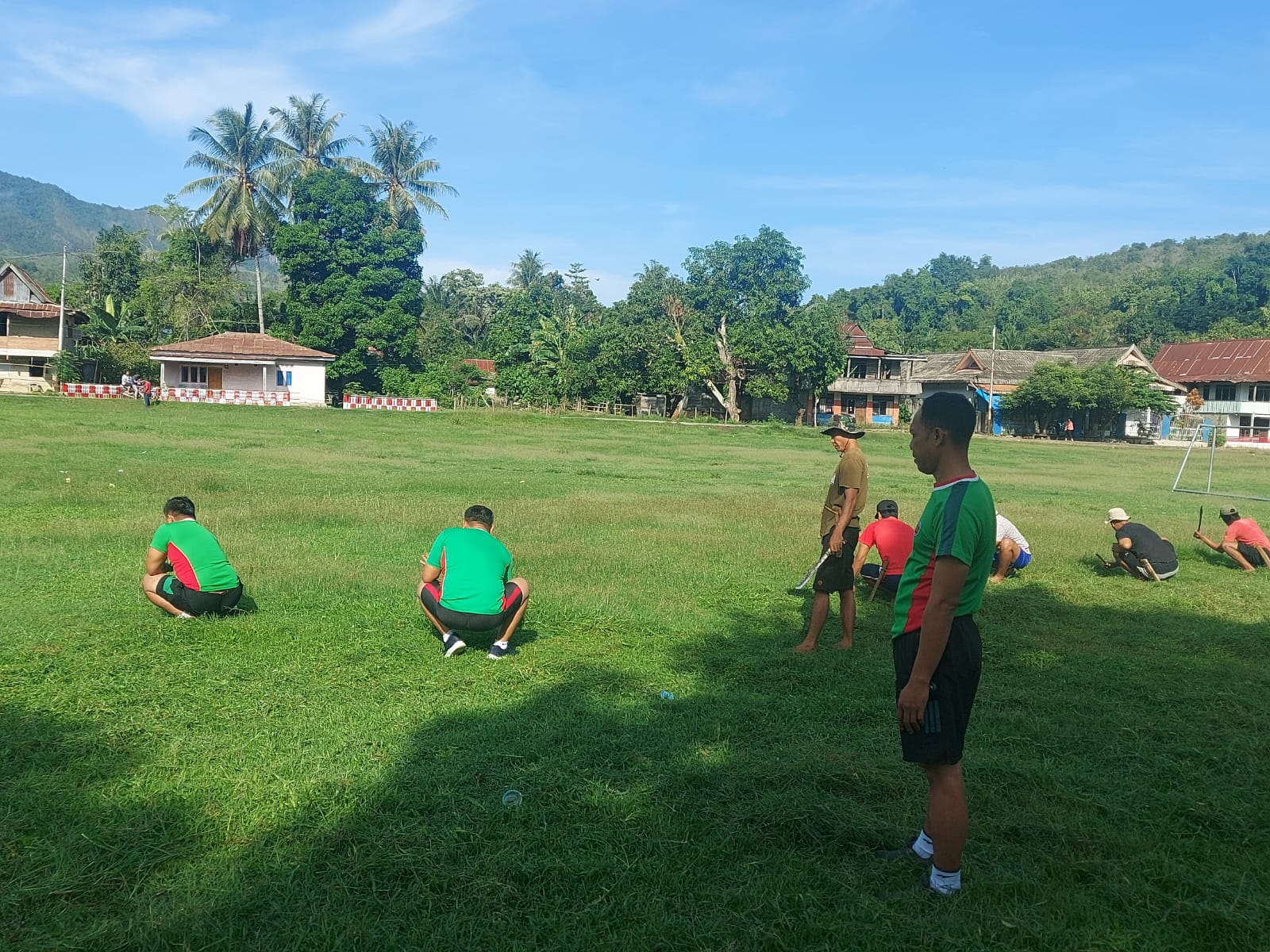 Lapangan yang menjadi pusat kegiatan olahraga ini mendapatkan sentuhan dari kolaborasi TNI dan Warga. Rumput-rumput liar yang sudah terlalu tinggi menjadi sasaran utama pembersihan. Mesin pemotong rumput dan sejumlah alat tradisional seperti sabit menjadi senjata untuk merapikan lapangan sepakbola.