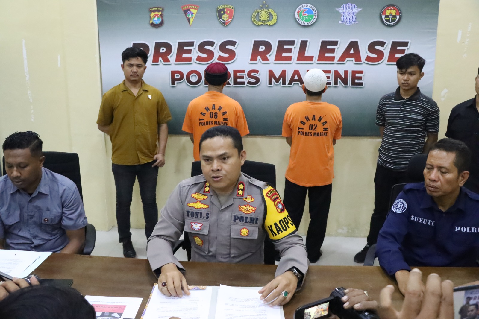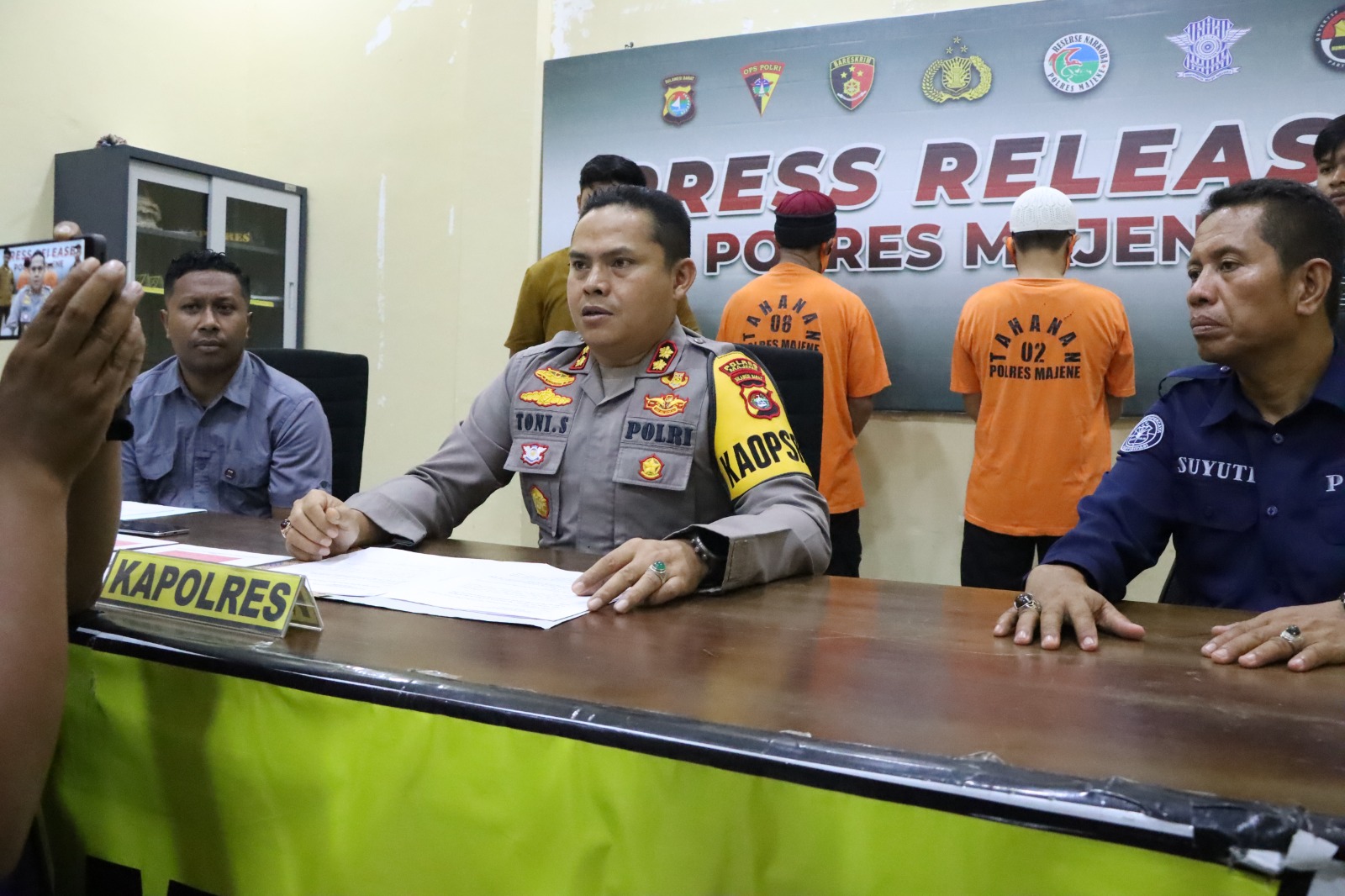 Menurut Kapolres Majene AKBP Toni Sugadri saat memimpin kegiatan press release di mapolres Majene, Selasa (21/5/24), mengatakan, kedua pelaku yang berhasil diamankan berinisial MS (34) adalah warga kelurahan Labuang Utara kecamatan Banggae Timur dan AR (39) seorang warga asal kelurahan Lalampanua kecamatan Pamboang.