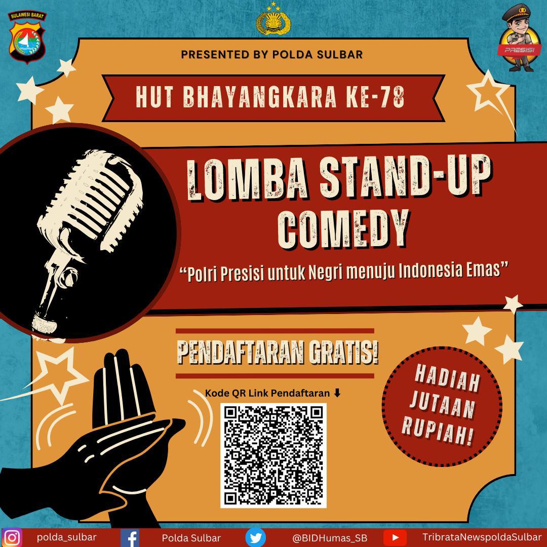 Mamuju,Mbs77Sulbar.com | Untuk menyambut dan memeriahkan hari bhayangkara yang ke 78, Kepolisian daerah sulawesi barat mengelar berbagai kegiatan lomba salah satunya adalah kompetisi Stand-up Comedy yang akan dibuka secara umum.