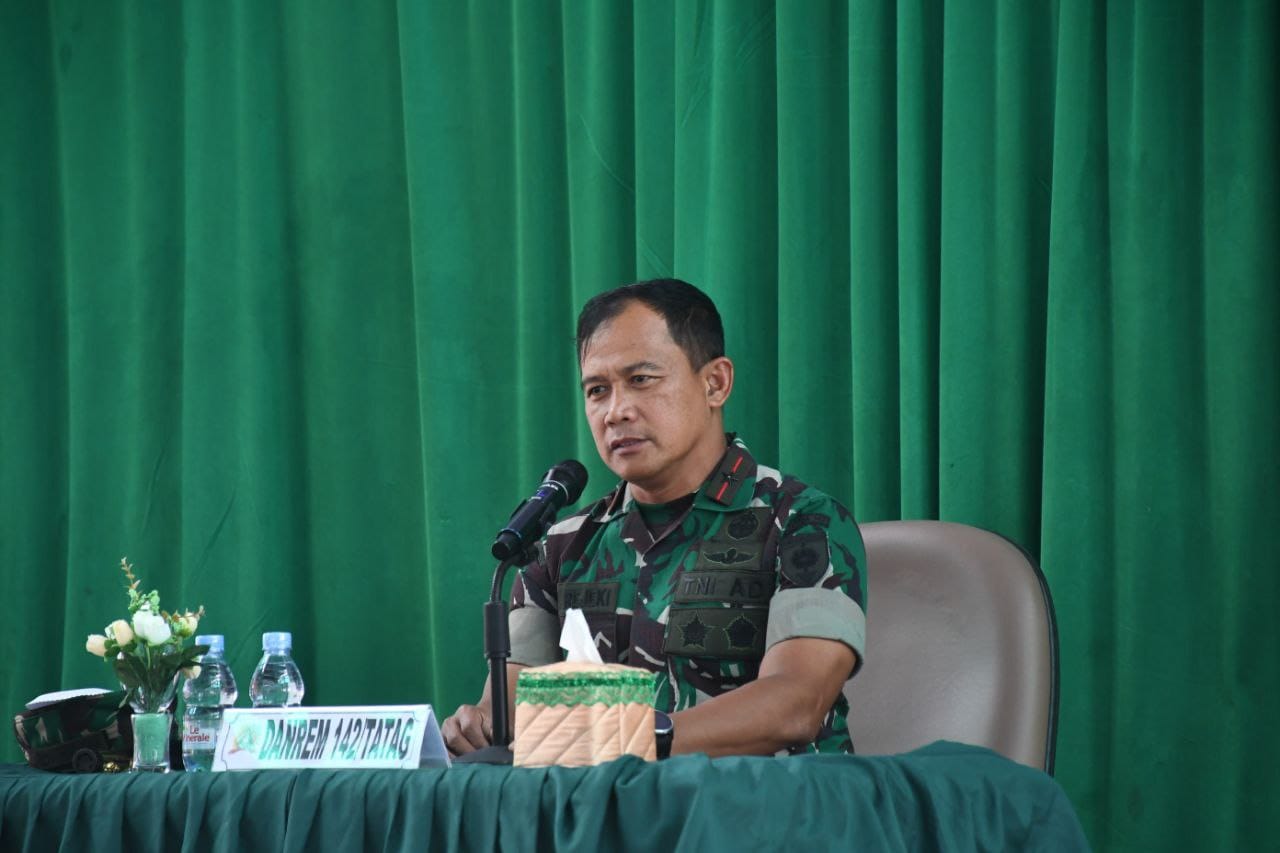 Pasangkayu, 77News.id – Danrem 142/Tatag, Brigadir Jenderal TNI Deni Rejeki, S.E., M.Si yang didampingi Kasi Intel Kasrem 142/Tatag Kolonel Kav Ir. Amran Wahid, S.T., M.M memberikan pengarahan kepada prajurit Kodim 1427/Pasangkayu dalam rangka kunjungan kerjanya di Makodim 1427/Pasangkayu.