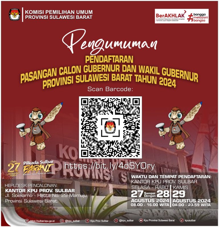 Perlu diketahui untuk selengkapnya pengumuman pendaftaran tersebut dapat diakses pada link : https://drive.google.com/file/d/1Xl8uQ6aVjwMyCu7swHMVjKwZPs4jorCy/view?usp=drive_link atau pada laman media sosial KPU Kabupaten Mamuju Tengah.
