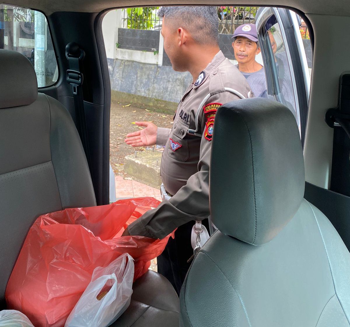 Satuan Lalu lintas Polresta Mamuju bagi makanan saat sedang laksanakan tugas patroli di jalan raya sepanjang kota mamuju. Jumat 30 Agustus 2024
