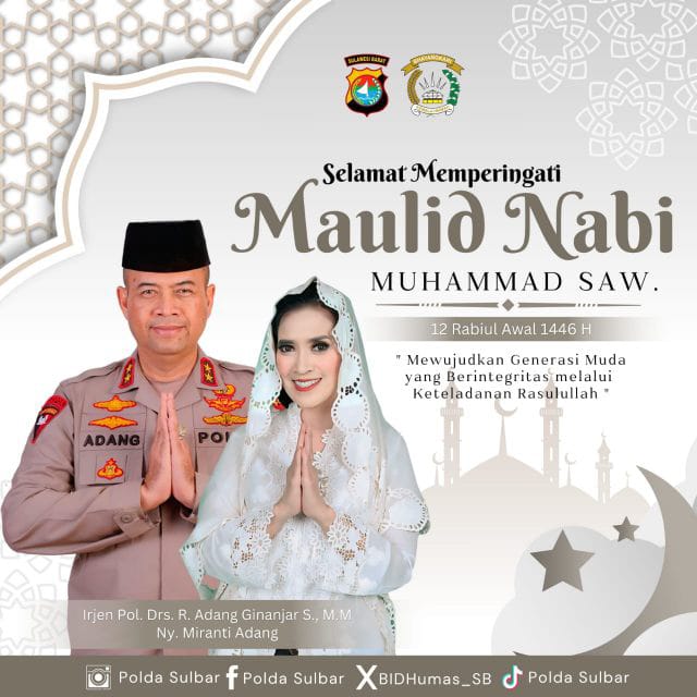 Mamuju, 77News.id Kepala Kepolisian Daerah Sulawesi Barat, Irjen Pol. Adang Ginanjar , bersama Ketua Pengurus Daerah Bhayangkari Sulbar, Ny. Miranti Adang Ginanjar, mengucapkan selamat memperingati Maulid Nabi Muhammad SAW yang jatuh pada 12 Rabiul Awal 1446 Hijriah.