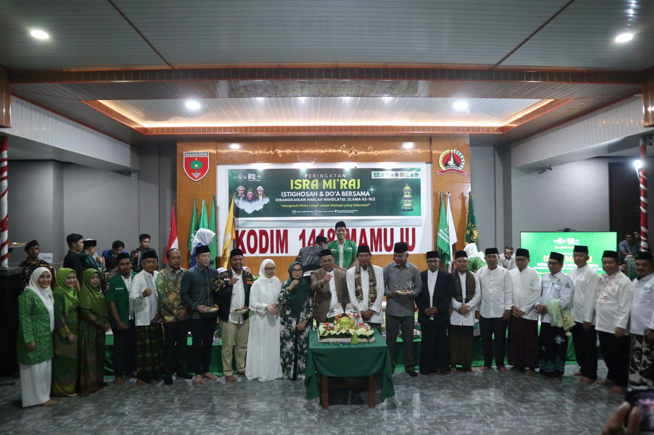 Mamuju, 77News.id – Pada Senin malam, 3 Februari 2025, Peringatan Isra Mi’raj Nabi Muhammad Shallallahu Alaihi Wasallam sekaligus perayaan Harlah Nahdlatul Ulama (NU) ke-102 berlangsung khidmat di Aula Kodim 1418/Mamuju, Jalan Yos Sudarso, Kelurahan Binanga, Kabupaten Mamuju. Acara yang mengusung tema “Mengetuk Pintu Langit untuk Mamuju yang Diberkahi” ini dihadiri oleh berbagai tokoh penting, ulama, dan masyarakat.