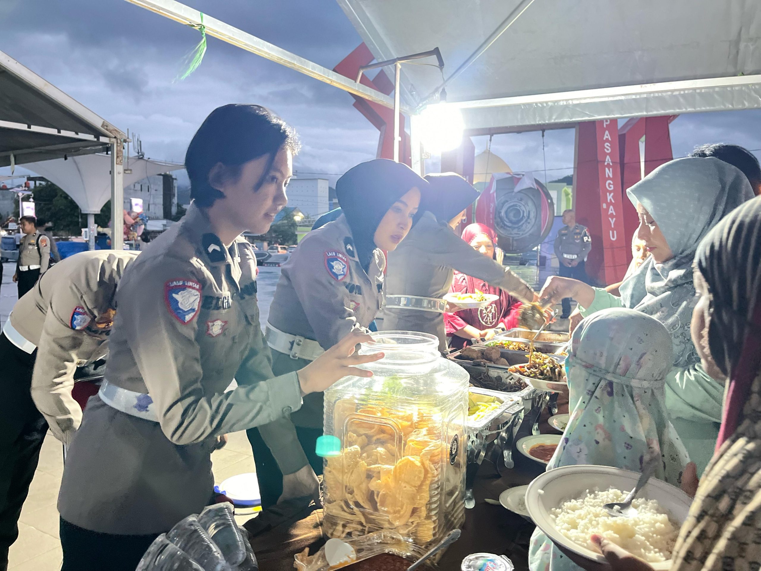 Suasana tenda Ramadan tak hanya dipenuhi oleh hidangan lezat, tetapi juga keakraban dan kehangatan. Para personel Ditlantas Polda Sulbar dengan sigap melayani masyarakat, memastikan semua masyarakat yang datang merasa nyaman dan terpenuhi kebutuhannya.