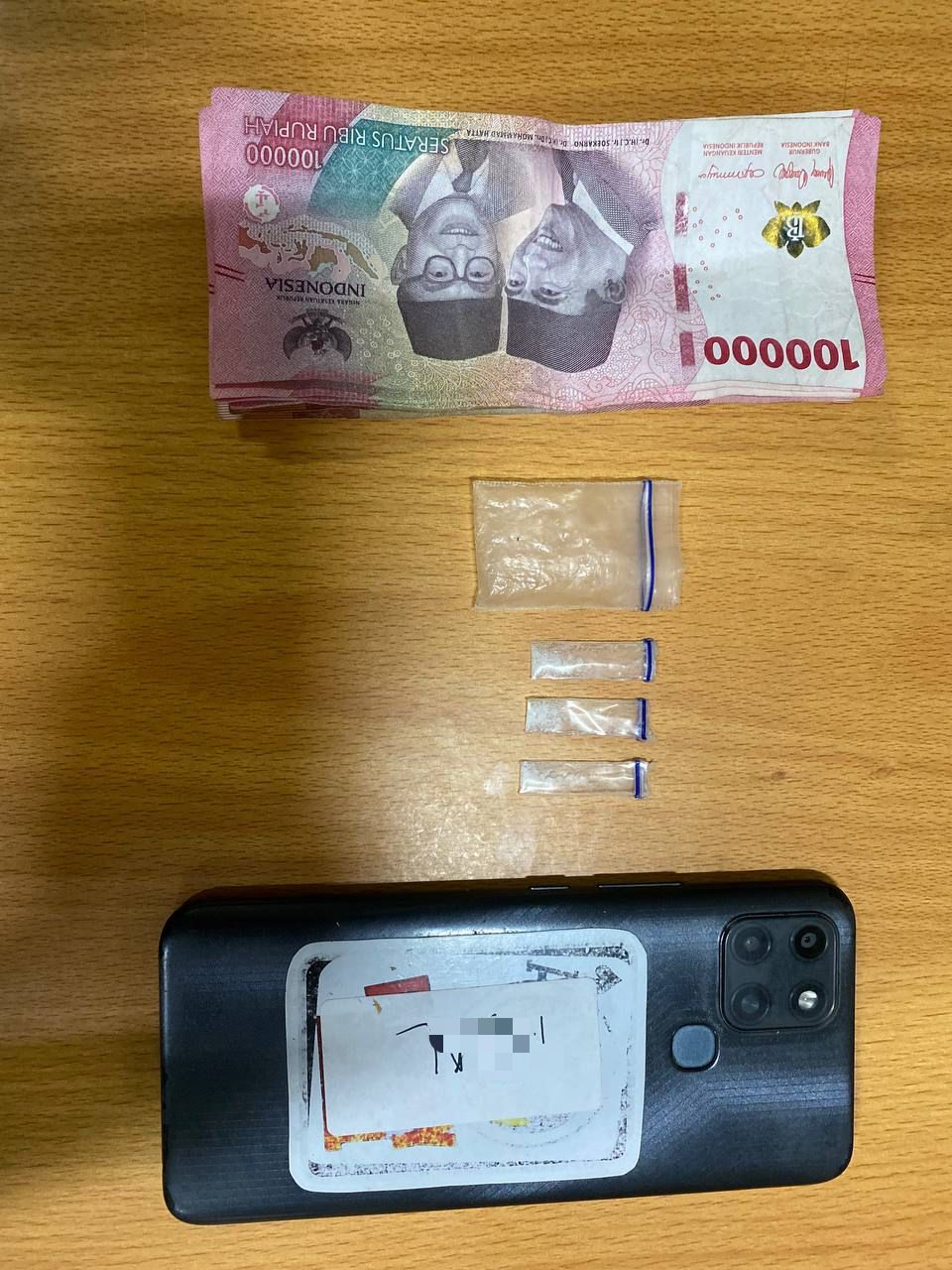 Dari tangan IK, petugas menyita tiga sachet yang diduga berisi sabu-sabu, sebuah telepon genggam dan uang tunai sebesar Rp600.000,-(enam ratus ribu rupiah), yang diduga merupakan hasil penjualan sabu-sabu.