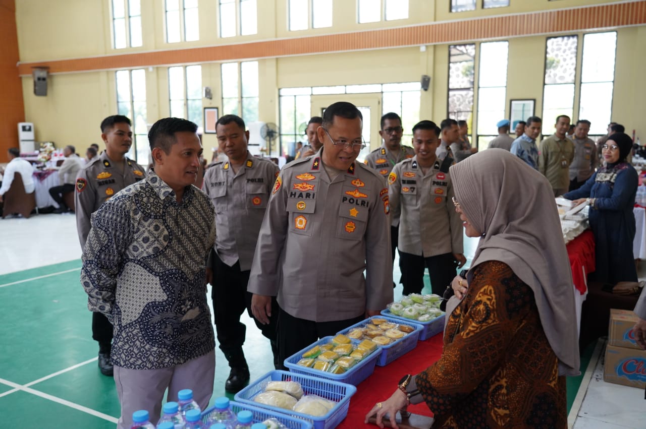 Usai membuka kegiatan secara resmi, Wakapolda Sulbar bersama para tamu undangan berkesempatan meninjau langsung berbagai stan jajanan yang ditampilkan sebagai contoh alternatif usaha mikro yang dapat dikembangkan oleh para peserta pelatihan.