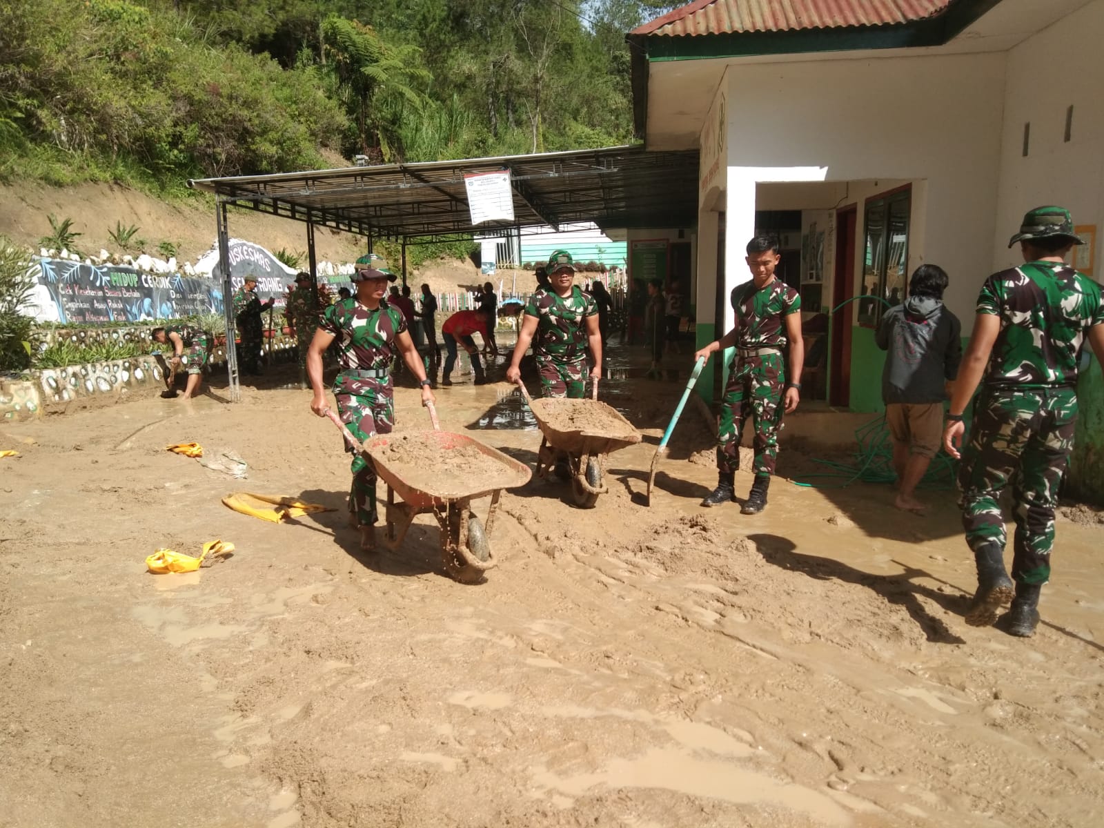 Serka Edy disela-sela kegiatan tersebut mengatakan bahwa tanah lumpur yang menutupi sebagian area Puskesmas Sesena Padang terjadi akibat hujan deras dengan intensitas yang tinggi mengakibatkan tanah lumpur menutupi sebagian area Puskesmas Sesena Padang. “Dengan alat seadanya, kami bersama pegawai Puskesmas dan dibantu masyarakat setempat bergotong-royong membersihkan lumpur yang menggenangi sebagian besar area Puskesmas” ungkapnya.