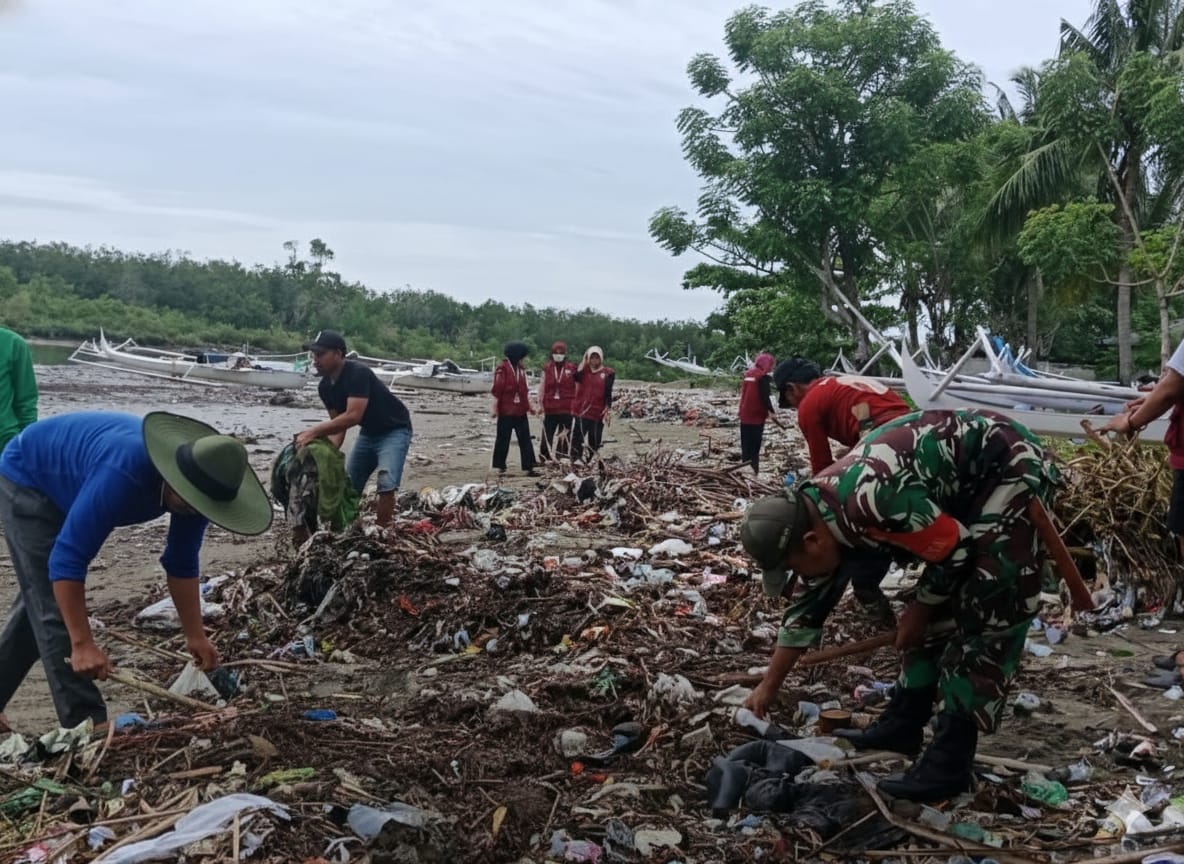 Kegiatan yang dipimpin Babinsa Koramil 1401-03/Sendana, Serka Baharuddin itu berlangsung sejak pagi dengan fokus mengangkat tumpukan sampah plastik dan material kayu yang terseret ombak ke bibir pantai.